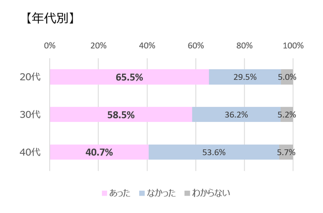 高校時代、部活における髪・身だしなみ・おしゃれに関するルールは全体では過半数の人が経験していました。年代別では、20代が65.5%と最も多く、40代とは25.2%の差になっていました。時代と共に、明文化されている校則については時代や社会状況に合わせて近年急速にアップデートされている一方で、部活のルールについては明文化されていないものも多いため慣習として残っているのかもしれません。