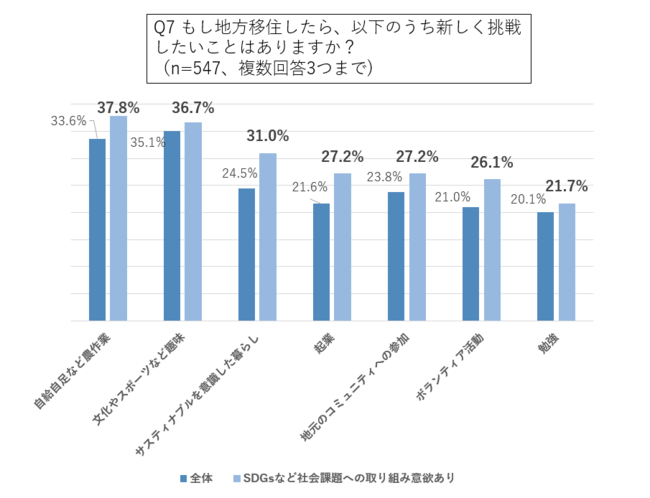 また、地方移住したら新たに始めたいことについては、社会課題に取り組む意欲がある人のほうが「サステナブルを意識した暮らし」(31.0%、全体比+6.5%)、「起業」(27.2%、全体比+5.6%)、「ボランティア活動」(26.1%、全体比+5.1%)について意向が高くなりました。
