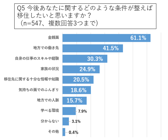 また、自分自身に関してどのような条件がそろえば移住したいかを尋ねた質問では「金銭面」が61.1%。次いで「地方での働き先」(41.5%)となったことから、転居や新生活に伴う費用が地方移住の際のネックになりそうであることが分かりました。