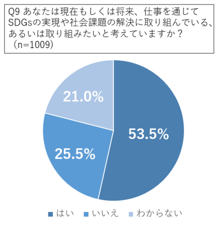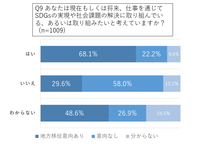 「現在や将来、仕事を通じてSDGsや社会課題の解決に取り組んでいる、あるいは取り組みたいと考えていますか」という質問に対して、半数以上となる53.5%が「はい」と回答。また、「はい」と回答した人のうち、地方移住に関心があるのは68.1%に上りました。一方、「いいえ」と回答した人は、地方移住への関心も29.6%と比較的低くなる傾向にあることが分かりました。