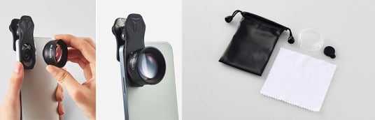 ▲ スマートフォンへの装着イメージ▲ クリップタイプで簡単に取り付けでき、ネジを締めることでしっかり装着▲ 収納ケース、レンズキャップ、レンズクリーナーが付属