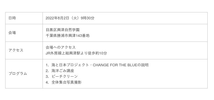 CHANGE FOR THE BLUE 千葉県実行委員会は、2022年8月2日(火)9時30分に千葉県勝浦市の目黒区興津自然学園で「海について学ぶ海洋ごみ講座」を開催します。本講座には勝浦中学校の1年生3クラスが参加します。CHANGE FOR THE BLUE 千葉県実行委員会が作成したワークショップ教材をもとに、NPO法人Wake Up Japan 代表理事の鈴木洋一氏が講師を務めます。講座終了後には興津海水浴場でビーチクリーンを実施することで、学習と実践を結びつけた包括的な教育を目指します。このイベントは、日本財団が推進する海洋ごみ対策プロジェクト「海と日本プロジェクト・CHANGE FOR THE BLUE」の一環で開催するものです。