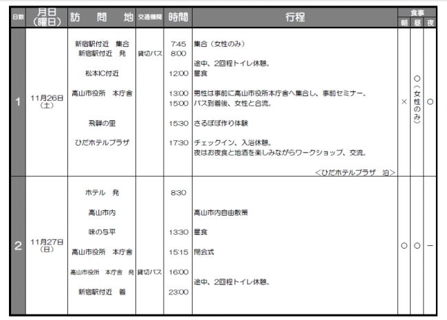 一方、ツアー参加男性には、女性が飛騨高山に移動する時間を使って、ツアー1日目の午前中に「ライフデザイン講座」を高山市役所にて開催いたします。自分らしい人生や結婚について考えたり、男女の脳の違いによる「思考方法」の違いを理解しながら円満な男女関係を築いていけるコミュニケーション方法を学んでいただくことで、女性との交流に役立て、カップル成立につなげます。