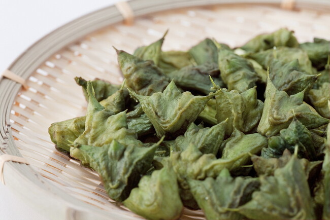 菱は、クリークや池など水の上に自生する水草の一種で、鋭いトゲのある実をつけるのが特徴です。菱の実は、デンプン質で栗の味に似ていて、英語ではWater chestnut(水栗)と言われています。日本には主に3種類の菱(ワビシ、トウビシ、オニビシ)が自生しています。
