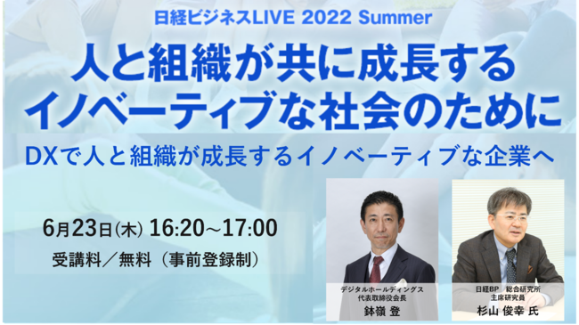 日本全国の企業のデジタルシフトをリードする、株式会社デジタルホールディングス(本社:東京都千代田区、代表取締役社長 グループCEO:野内 敦、以下、デジタルホールディングス)の代表取締役会長 鉢嶺 登が、本年6月22日(水)~24日(金)の3日間にわたり開催されるオンラインセミナーイベント「日経ビジネスLIVE 2022 Summer 人と組織が共に成長するイノベーティブな社会のために」へ登壇することをお知らせいたします。