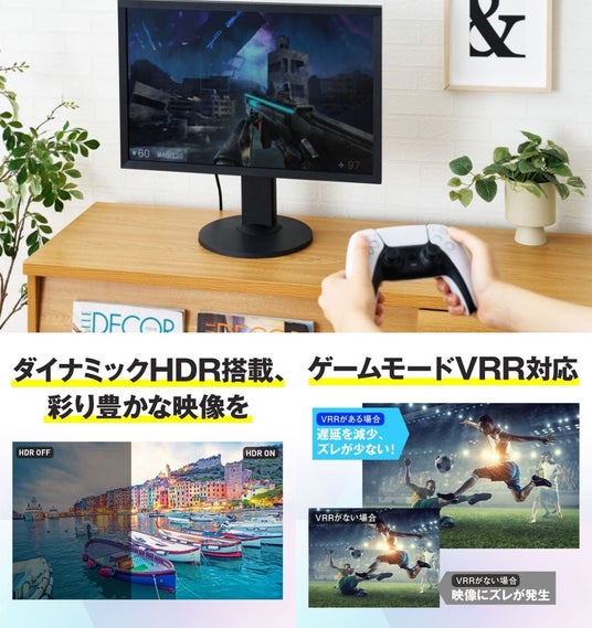 ■ゲームモードVRRに対応し、可変リフレッシュレートによりパソコンなどの機器とディスプレイの間で起こるタイムラグやカクつきを最小限に抑え、なめらかな映像伝送を行います。
