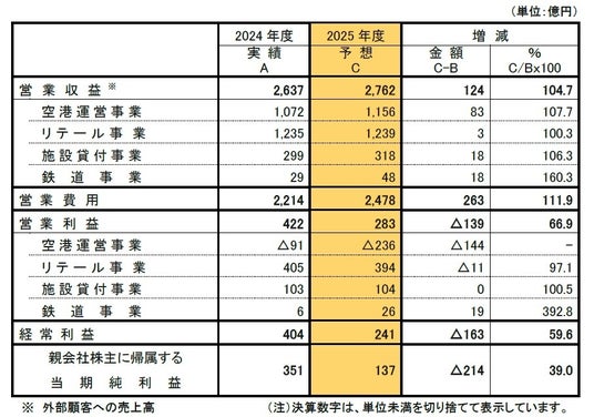 ▶リテール事業 : 国際線旅客数は2024年度を上回る見込みであるものの円安効果が一服することから、営業収益は2024年度並の1,239億円となり、営業利益は2024年度から11億円減益の394億円となる見通しです。