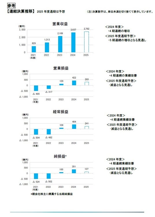 ▶鉄道事業 : 料金改定により線路使用料収入が増収となり、営業収益が2024年度から18億円増収の48億円、営業利益は2024年度から19億円増益の26億円となる見通しです。