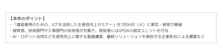 現在、建設業界では生産年齢人口の減少と建設技術者の高齢化に伴い、労働力不足が深刻化しています。そこでヒューマンタッチ総研は、こうした課題の解決に向け、生産性向上推進に寄与することを目的に、建設技術者らを対象としたセミナーを開催します。