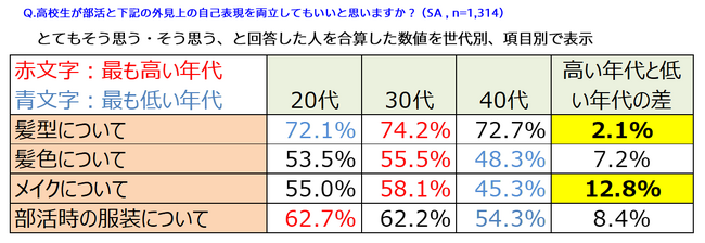 高校生が部活と外見上の自己表現を両立することへの賛否、「メイク」は世代差有りで、「髪型」は世代問わず賛成派が7割越え!