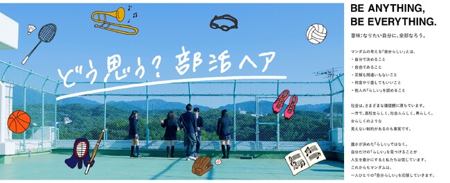昨今、ブラック校則などが話題になる中で、多くの現役高校生からヒアリングを実施したところ、部活シーンにおいても理不尽なルールがあることが分かってきました。そこで、高校生が自己表現と部活を両立して学校生活を楽しめるよう「部活ヘア」の存在に着目しました。マンダムは、高校生の見た目やルールに関する「理不尽や納得できないもやもや」を取り除き、自己表現をできる環境を整えることで、高校生が自らで考える経験とともに充実した高校生活をサポートしたいと考えます。