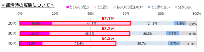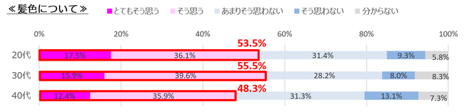 また、賛成派の「とてもそう思う」と「そう思う」の合計では、30代が最も高い項目が多かったのですが、「とてもそう思う」に関しては、「髪色」「メイク」「部活時の服装」において20代が最も高くなっていました。若い世代は強く実感している人が多いようです。