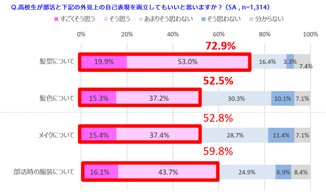 高校生が部活と外見上の自己表現を両立することへの賛否、「髪型」は7割以上が賛成!「髪色」「メイク」とは約20%の差に