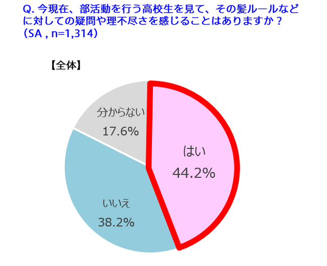 現在、部活を行う高校生を見て、髪ルールへの疑問や理不尽さを感じるかの質問に「はい」と回答したのは44.2%で、「いいえ」の38.2%よりも多くなっています。世代別では、「はい」と回答したのは20代が最も多く54.8%で、30代は46.9%、40代は30.8%と年代が上がるにつれて低くなっていました。20代と40代では24%の大差があり、世代によって意識が異なる結果となりました。