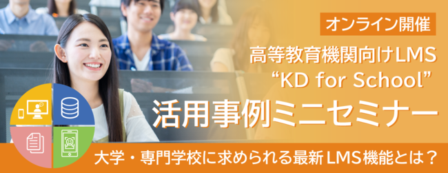 導入実績2000超を誇るeラーニング専門ソリューション企業、株式会社デジタル・ナレッジ(本社:東京都台東区、代表取締役社長:はが弘明)は、2023年3月17日(金)12時20分より30分間、<高等教育機関向けLMS “KD for School”>活用事例ミニセミナー「大学・専門学校に求められる最新LMS機能とは?」をオンライン開催いたします(https://www.digital-knowledge.co.jp/archives/30736/?pr)。また、2023年2月7日(火)開催分も受付中です(https://www.digital-knowledge.co.jp/archives/30471/?pr)。