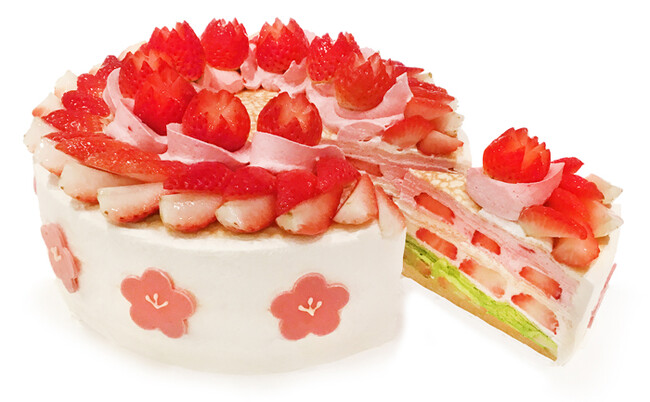 ひなまつりを象徴する菱餅の色は、赤(ピンク)=太陽の色に通ずる魔除け、白=清浄・純白の雪/子孫繁栄、緑=蓬(よもぎ)健康と強い生命力、とそれぞれが意味を持ち、健康に育つようにとの思いと、親から子への愛情が込められています。その菱餅のそれぞれの色のクリームをサンドし、旬のいちごをパティシエの技で華やかに飾りました。