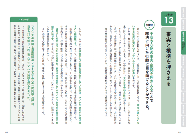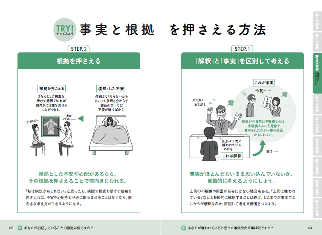 ↑スキルを実践するための具体的な方法を図解で解説。ページ下部にある2つの質問に答えることで、すぐに考え方をプラスに変えることができます。