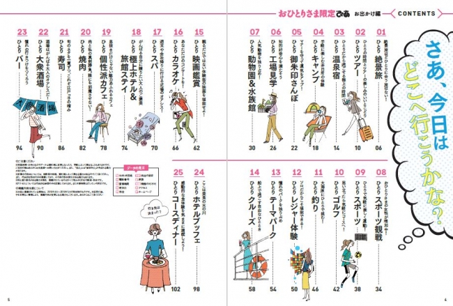 本誌では、25のテーマに分けてひとりお出かけスタイルを紹介。