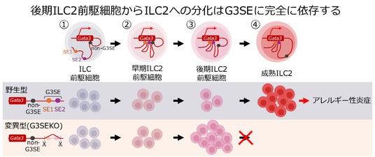 SE1とSE2を欠損したマウス(G3SEKOマウス)を作製したところ、予想通りG3SEKOマウスではTh2細胞の分化はほとんど正常ですが、ILC2がほぼ完全に欠損していました。ILC2は骨髄で分化し、1.ILC前駆細胞、ILC2前駆細胞(我々は2.早期ILC2前駆細胞と呼びます)を経て骨髄ILC2へと分化します。G3SEKOマウスではILC前駆細胞、早期ILC2前駆細胞は正常に保たれているものの、新たに我々が見出した3.後期ILC2前駆細胞で分化が停止していました。さらに各分化段階のオープンクロマチン解析(注6)により、ILC前駆細胞まではG3SEを介さないGATA3誘導機構が中心的な役割を果たし、早期ILC2前駆細胞ではG3SEを介した誘導機構とG3SEを介さない誘導機構が併存し、後期ILC2前駆細胞ではG3SEを介さないGATA3誘導機構は消失し、完全にG3SEを介する誘導機構に依存することが明らかとなりました。