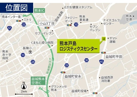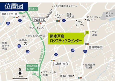 当該地は、九州で3番目に人口の多い熊本市の中心部から東へ約10kmの場所に位置し、九州地方の南北を結ぶ九州縦貫自動車道「益城熊本空港IC」から約5.5km、「熊本IC」から約8.8kmと交通利便性の高い場所に位置しています。また、半導体関連工場の集積地である菊陽町・大津町・合志市にも近接しており、物流施設の立地として高いポテンシャルを有しています。