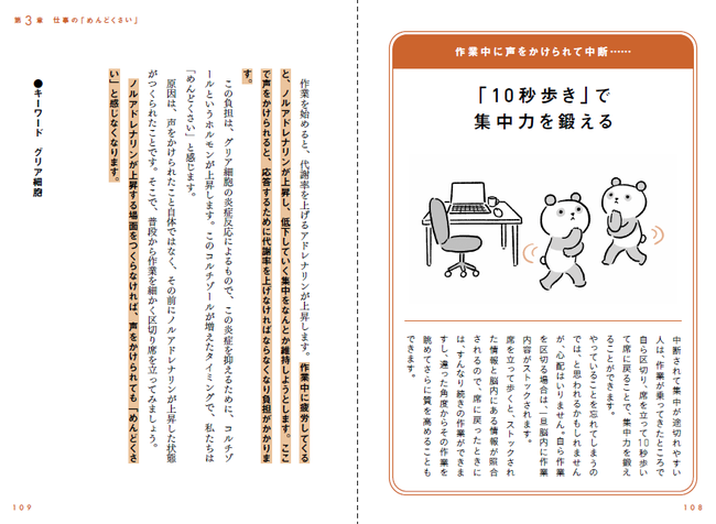 見開き1ページのうち、右ページでお悩みとその解決策、そして左ページで、なぜそれで「めんどくさい」が消えるのか、そのメカニズムを説明します。