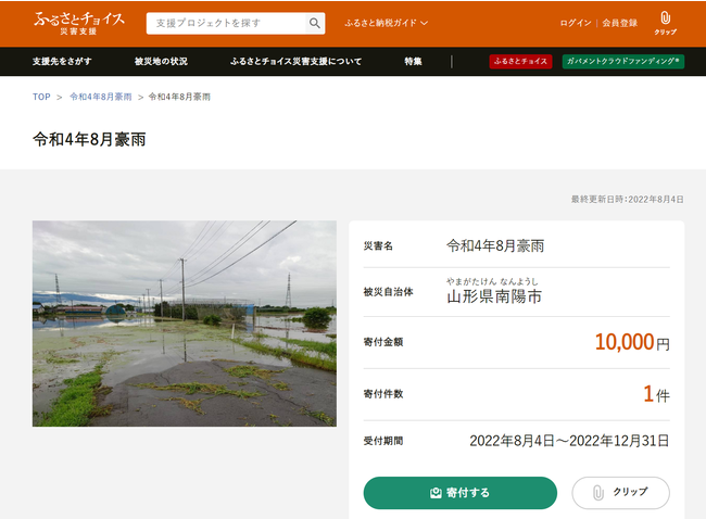国内最大級のふるさと納税総合サイト「ふるさとチョイス」を企画・運営する株式会社トラストバンク(本社:東京都渋谷区、代表取締役:川村憲一、以下「トラストバンク」)は8月4日、ふるさと納税で被災自治体の災害支援に寄付できる仕組み「ふるさとチョイス災害支援」( https://www.furusato-tax.jp/saigai/ )で、青森県むつ市、新潟県村上市に続き、東北北部で発生した記録的大雨により被災した山形県南陽市、小国町の「災害時緊急寄付申込みフォーム」を開設しました。寄付金は全額、被災地の復旧・復興に使われます。