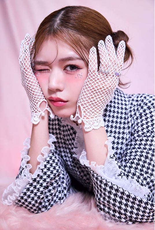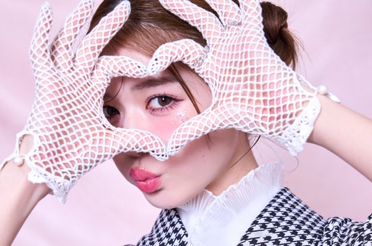 トレンドの高めチーク、オーバーリップのピンクメイクをベースに、