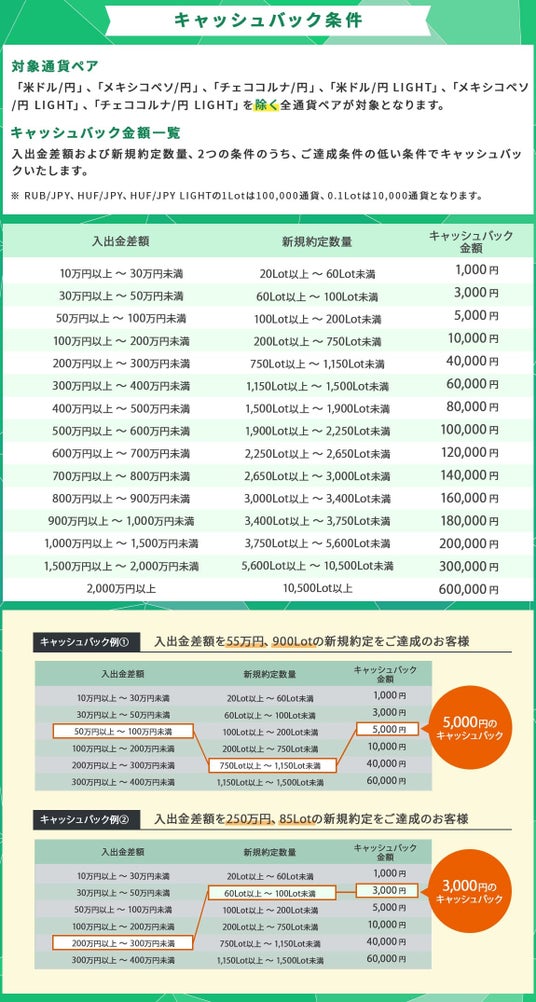 キャンペーン期間中におけるお客様の入出金差額、および「みんなのFX」「LIGHT FX」の新規約定数量に応じて、入出金差額の最大3%をキャッシュバックいたします。
