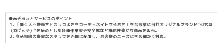 1.「働く人へ快適さとカッコよさをコーディネイトするお店」を合言葉に当社オリジナルブランド“和玄屋(わげんや)”を始めとした各種作業服や安全靴など機能性豊かな商品を販売。