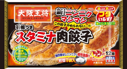 パリッと焼ける感動の羽根!油・水・フタいらずで簡単に羽根つき餃子が作れます。自家製の隠し味で大阪王将の冷凍食品でしか味わえない香りとコクが味わえます。豚肉2倍で肉肉しい餃子にリニューアルしました。