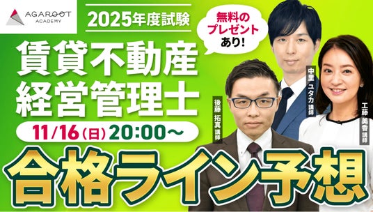 株式会社アガルート(本社:東京都新宿区、代表取締役:岩崎 北斗)が運営する「アガルートアカデミー」は、賃貸不動産経営管理士試験当日の11月16日(日)に 「解答速報」、「総評動画YouTubeLIVE配信」「合格ライン予想動画YouTubeLIVE配信」を無料で実施いたします。