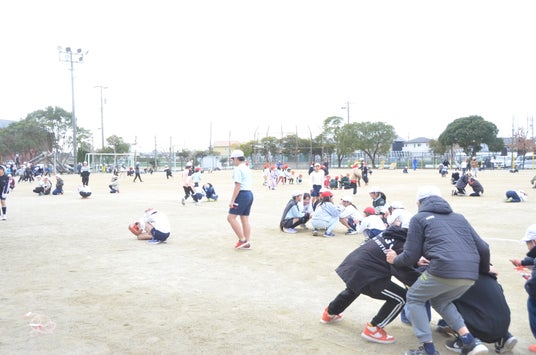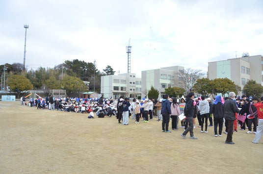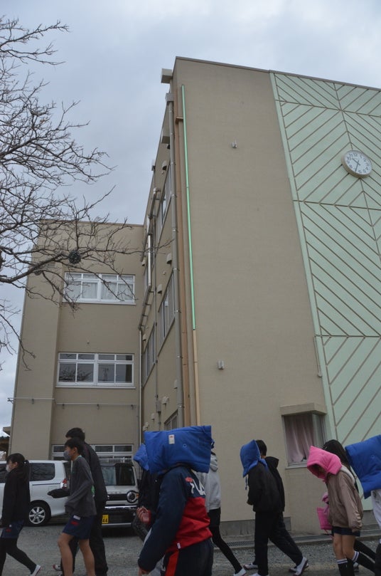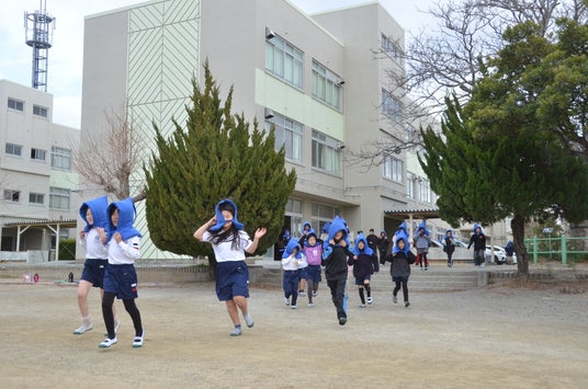 この日は出前授業に先立ち、全校児童568人を対象にした地震避難訓練が実施されました。地震発生の放送が流れると、屋外にいた児童はその場にかがんで身を守りました。揺れがおさまると、運動場に集まり、校舎内の児童も防災頭巾をかぶって速やかに運動場へ避難し整列。緊迫感のある訓練となりました。