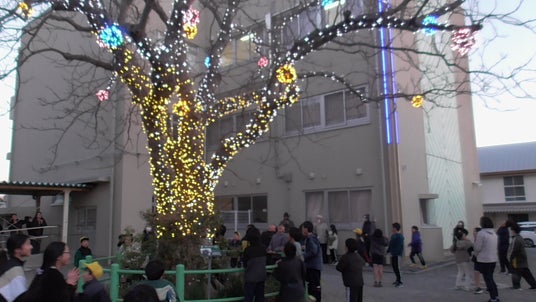 児童の下校後17時からは、校舎に設置された「ⅬEⅮ光センサアラートシステム」の前に立つ、樹齢146年のシンボルツリー「無患子(ムクロジ)の木」に施されたイルミネーションの点灯式が行われました。