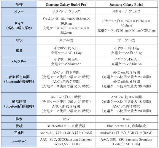 <主な仕様 : 「Samsung Galaxy Buds4 Pro」「Samsung Galaxy Buds4」>