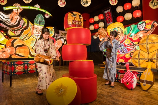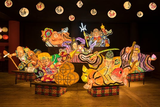 七福神は福を招く神様として知られています。青森屋のパブリックスペース「じゃわめぐ(*4)広場」に恵比寿天、大黒天、毘沙門天、弁財天、布袋尊、福禄寿、寿老人の7体のねぶたが登場し、宿泊者を出迎えます。制作者はねぶた師の内山龍星(うちやまりゅうせい)氏と立田龍宝(たつたりゅうほう)氏です。ねぶたでつくられた七福神を間近で眺めることができ、記念写真を撮影するのがおすすめです。