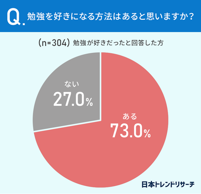 73%と、およそ7割以上の方が「勉強を好きになる方法はあると思う」と回答しました。