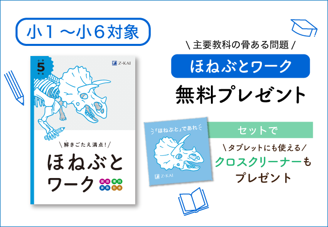 Z会小学生コース・小学生タブレットコースの資料をご請求いただいた方に、期間限定特典『ほねぶとワーク』と「ほねぶとクロスクリーナー」をプレゼント。