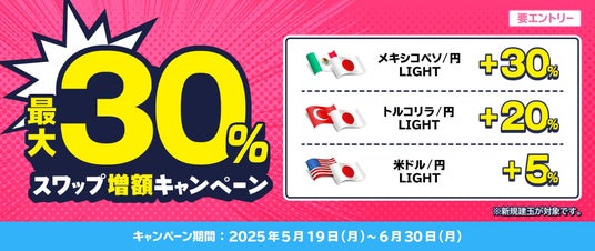 2025年5月19日(月)~2025年6月30日(月)の期間におきまして「最大30%スワップ増額キャンペーン」を開催いたします。