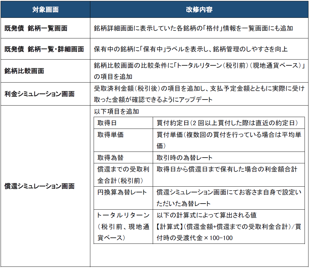 また、新機能追加に加え、債券取引サイトの各種機能のアップデートも行います。