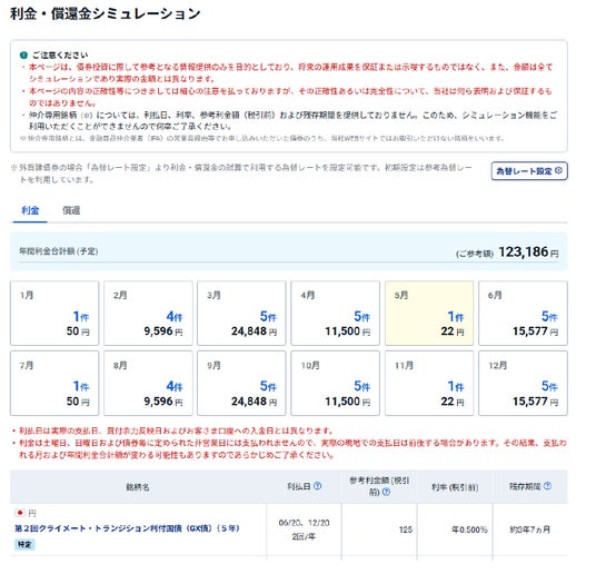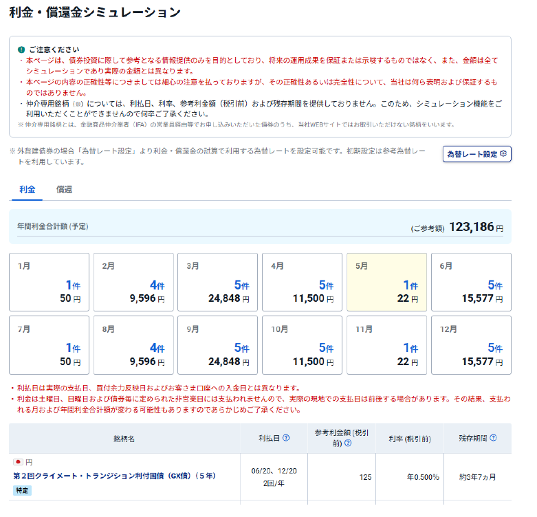 債券ごとの参考利金額(次回支払われる予定の利金額)等も表示しています。