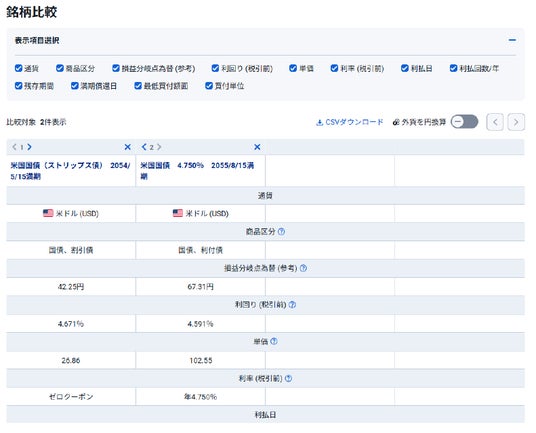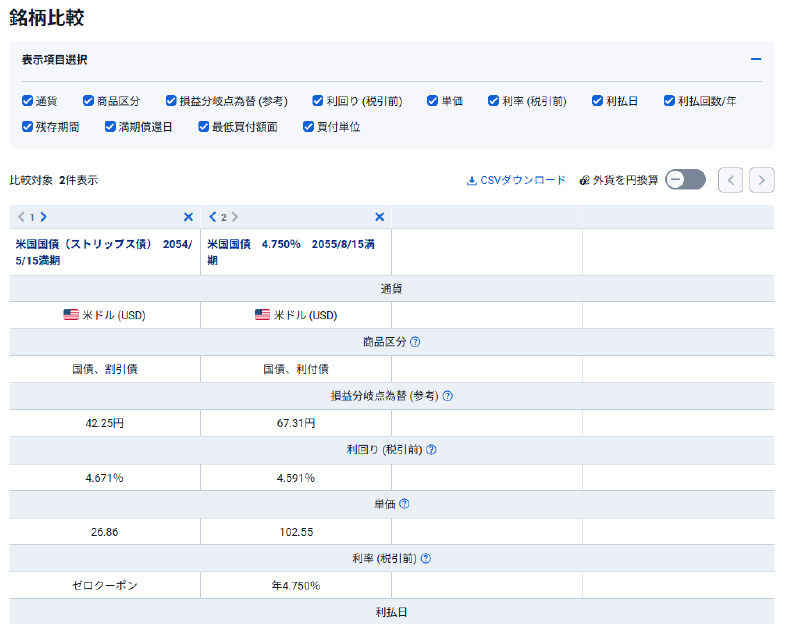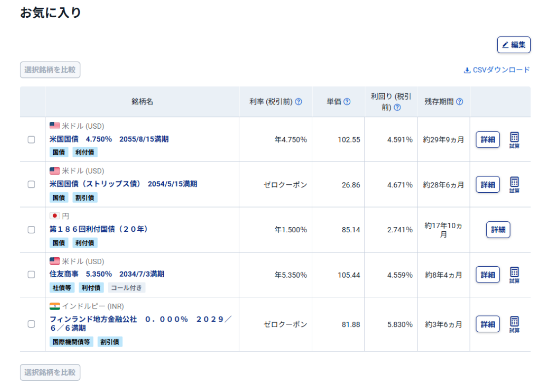 取扱いの円貨建て・外貨建て 既発債券について、利回り・残存期間をはじめとして選択いただいた条件で複数銘柄を比較できます。債券の主要な条件の一画面での確認が可能です。