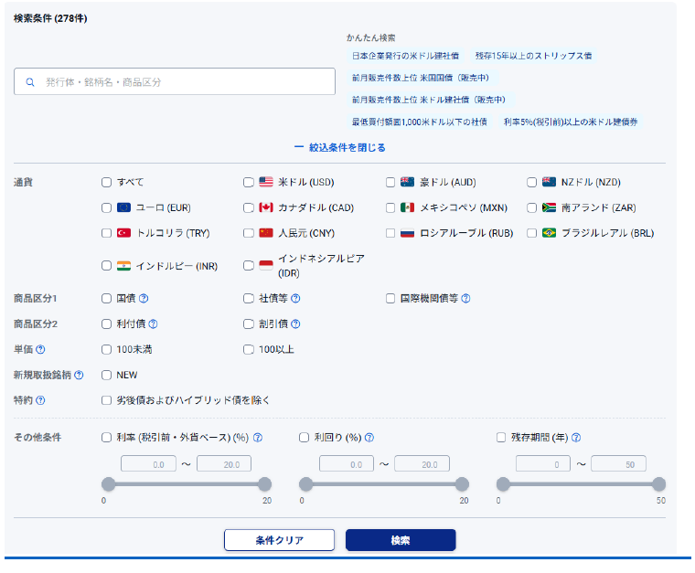 取扱いの既発債券について、商品区分や利率、利回り、残存期間等で絞込検索が可能です。