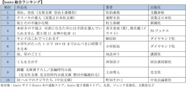 hontoランキングは、honto サイトと、honto サービス実施店の丸善、ジュンク堂書店、文教堂などで購入された書籍や電子書籍の販売データをもとに集計しています。