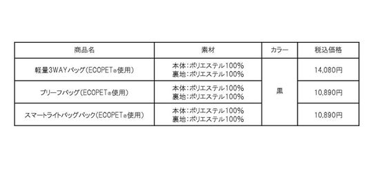本シリーズには、製造工程で発生したポリエステル屑や、回収された使用済みポリエステル製品等から再生されたリサイクルポリエステル繊維「ECOPET(R)」を使用しております。大容量で出張にもおすすめの「軽量3WAYバッグ」と、持ち手が柔らかく持ちやすい就活にもおすすめの「ブリーフバッグ」、レザー調を採用することで上品に見え、ビジネスでもプライベートでもお使いいただける「スマートライトバッグパック」の3種類が登場いたしました。