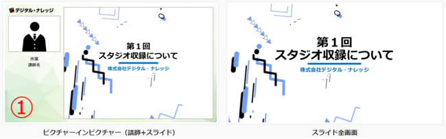 『ピクチャーインピクチャー(講師+スライド)』形式または『スライド+音声』のどちらかをお選びいただけます。また、ご提供いただけましたらロゴを掲示することも可能です。