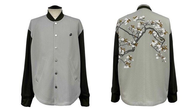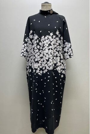 服全体の中心部にボーダー状の桜を密集させ、上下に花弁が舞う構図でデザインしました。ゆったりとした量感や、6分丈の袖、スタンド襟で、ミニマムでありながら印象に残るシルエットをつくりました。