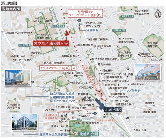 「オウカス 浦和針ヶ谷」は、江戸と京都を結ぶ中山道の宿場町として古くから人々が交流し、豊かな自然に恵まれた浦和区に初めて誕生します。大宮台地に位置する本物件は、JR 京浜東北線「北浦和」駅および「与野」駅からフラットなアプローチでアクセスでき、日常の移動も快適なロケーションです。穏やかな住環境が広がる「浦和区針ヶ谷」エリアには、生活に必要な利便施設が駅周辺にコンパクトに集まっており、クイーンズ伊勢丹 北浦和店やマルエツ 北浦和東口店をはじめ、平和通り商店街など、地域に根付いた商店街も充実しています。