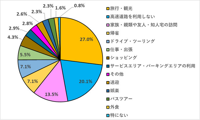 高速道路を利用した用途について複数回答可で質問したところ、「高速道路を利用しない」20.1%の回答を除くと、「旅行・観光」が27.0%と最多、次いで「家族・親類や友人・知人宅の訪問」が13.5%、「帰省」が7.1%という順になりました。旅行や観光目的で利用する方が多いようですね。