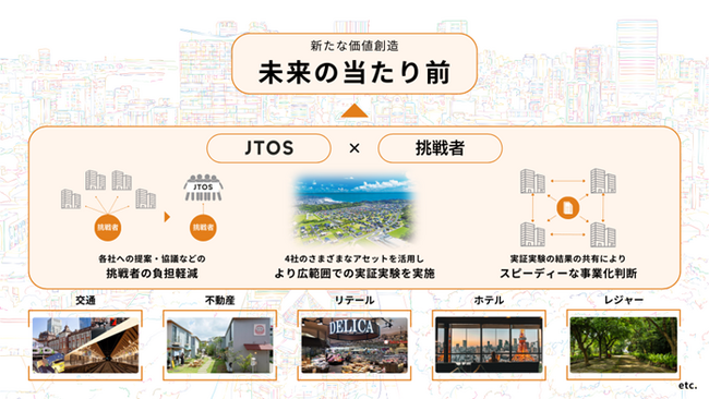 本コンソーシアムは、スタートアップ企業を取り巻く社会実装に向けたさまざまな障壁を乗り越えるために、各社が有する駅や鉄道、不動産などの経営資源、グループ事業における情報資源を掛け合わせた広大な実証実験フィールドを提供し、スタートアップ企業の挑戦者の皆さまと共に未来の当たり前を創造していきます。
