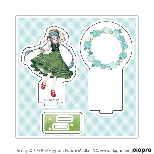 草原をイメージさせるグリーンの台座パーツに、キャラクターパーツと花冠の背景パーツを差し込んで完成させるアクリルスタンドプレート。描き起こしイラストの全身姿を見ることができるので、可愛い衣装や“らしさ”あふれるポーズにもぜひ注目を!
